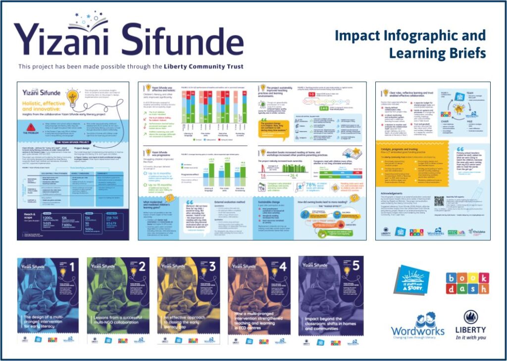 Wordworks is proud to be able to release a series of publications about the Yizani Sifunde early literacy project, which was implemented in the Eastern Cape between 2021 and 2023, in a collaboration between Wordworks, Book Dash and Nal’ibali and with local partners Khululeka and ITEC. The project was made possible by the Liberty Community Trust. The project was based on Wordworks’ Little Stars programme* for ECD classrooms and also included caregiver workshops based on the Every Word Counts programme*.